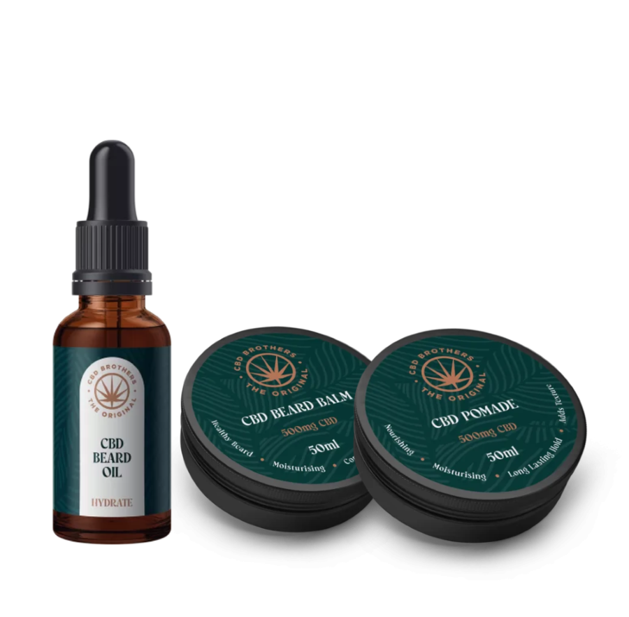 Discover the Men’s Grooming Kit 2, featuring CBD Beard Oil Hydrate, CBD Beard Balm, and CBD Pomade for nourished hair and beard styling. Shop now.